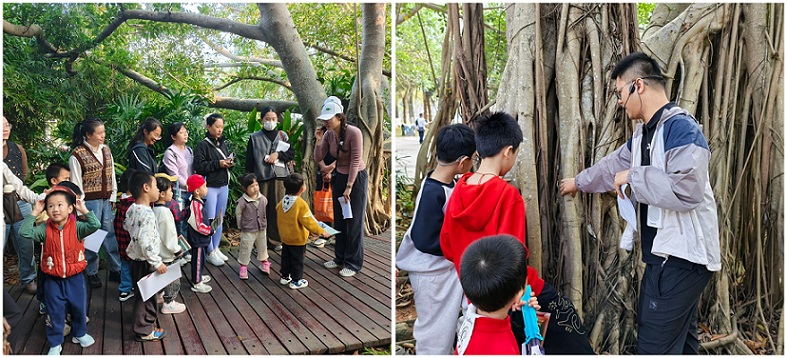 活动以“大自然的‘老寿星’”科普讲解拉开序幕。我院科普讲解员采用通俗易懂的儿童化语言,向孩子们生动介绍:树龄超过百年的树木即为古树,它们不仅是岁月变迁的“见证者”,更是净化空气、庇护动物的“生态家园”。小朋友们围聚在古榕树旁仔细观察,对古树的好奇与探索欲被充分点燃。