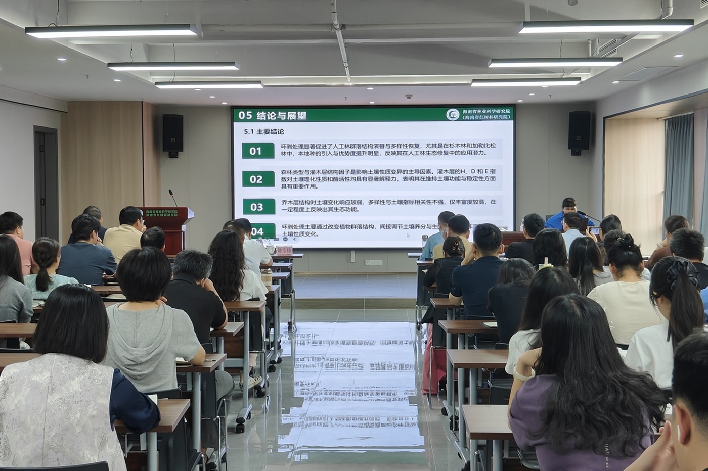 我院热带林业经济研究所王小燕高级工程师分享了近自然改造对海南热带人工林群落结构与功能影响的研究成果。